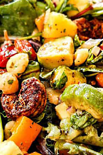 Ein toller Salat aus marinierten Garnelen, cremiger Avocado, Ananas, Mangos, Kiwis, Orangen und Jicama, bestreut mit gerösteten Kokosnüssen und gerösteten Macadamianüssen, alles übergossen mit einer würzigen, frischen karibischen Zitrusvinaigrette.