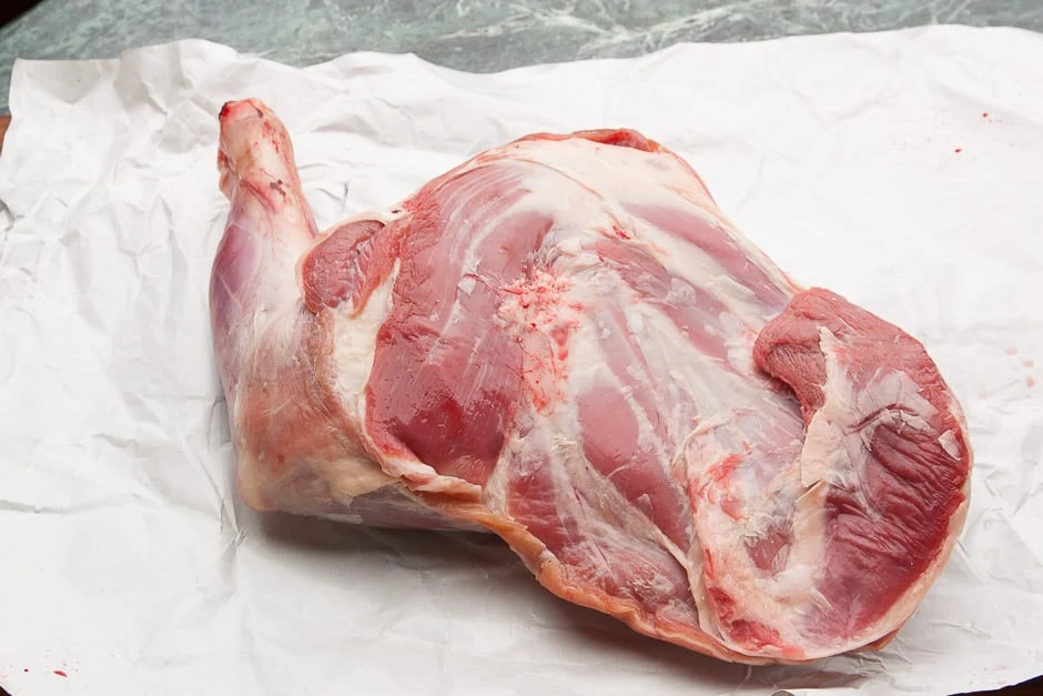 - Die Keule entbeinen, abspülen und trockentupfen.