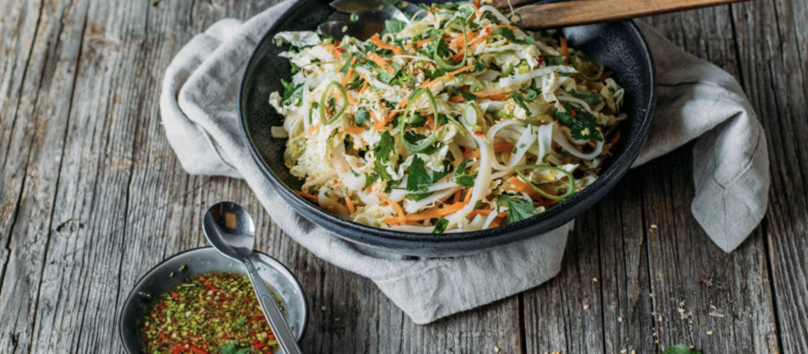 So macht der unspektakuläre Chinakohl was her: feine asiatische Aromen verbinden den leicht herben Chinakohl mit den Reisnudeln und Chili zu einem wunderbaren Chinakohlsalat. Man kann ihn gut vorbereiten, denn je länger der Salat zieht, desto besser schmeckt er.