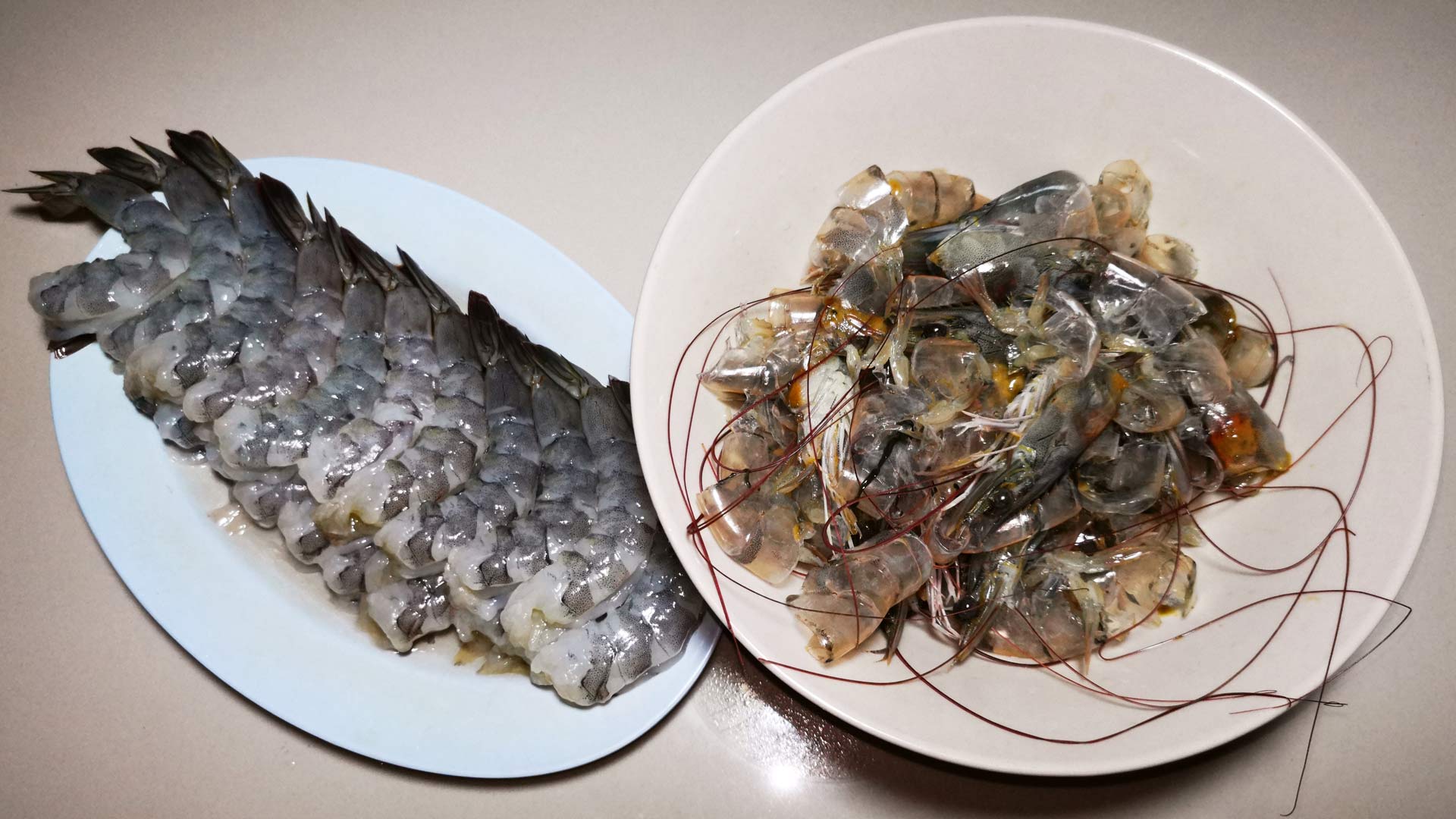 • Von den Garnelen Kopf und die Schalen entfernen. Wichtig: diese wirfst du nicht weg, denn wir brauchen sie noch für die Brühe.