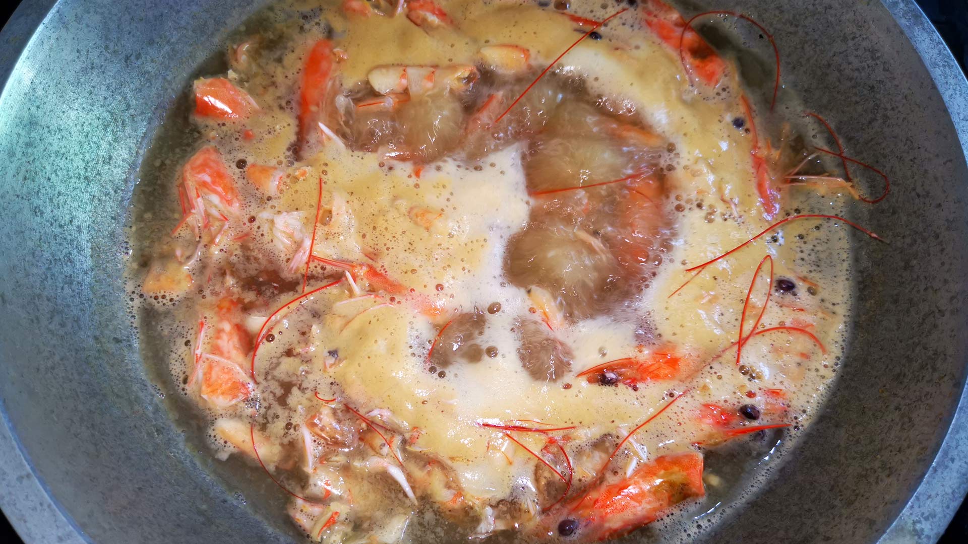 • Jetzt kommen die Garnelen dazu. Nicht zu lange köcheln lassen.