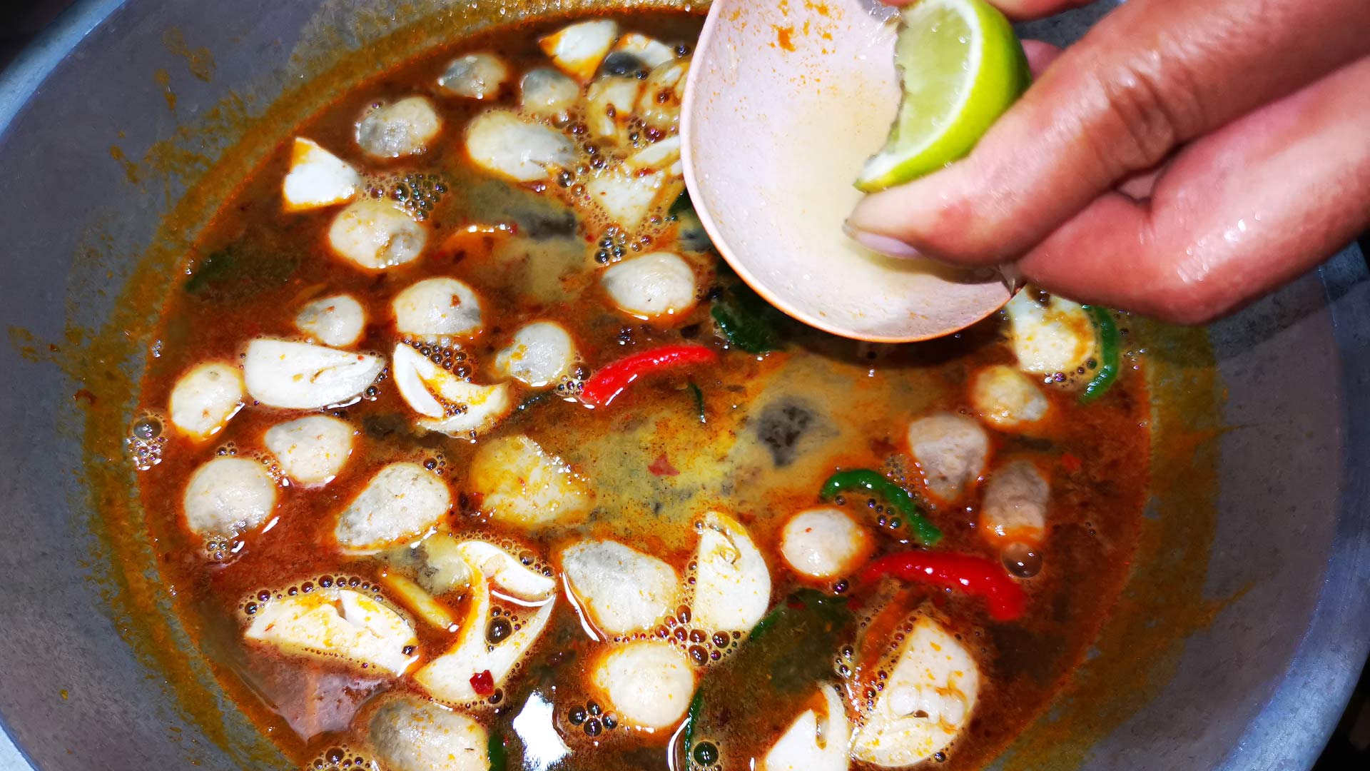 • Mit Zucker und Fischsauce abschmecken. Beachte, dass Tom Yam einen frisch-säuerlichen Geschmack haben muss, der von den Limetten kommt. Sollte der Limettengeschmack nicht stark genug sein, gib noch etwas mehr Saft hinein.