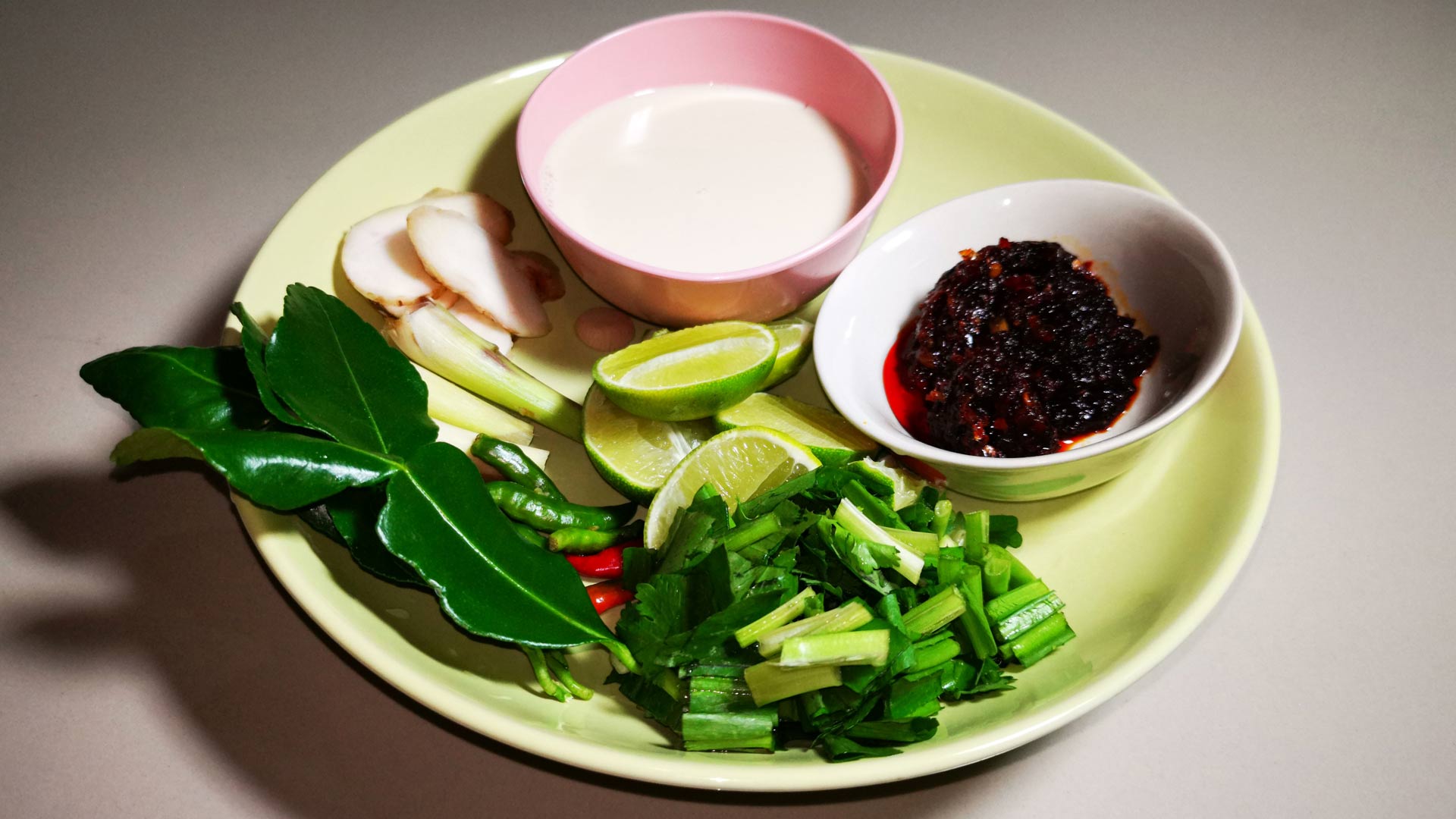 • Die Galangtwurzel wird in kleine Scheiben und die übrigen Zutaten in kleine Stücke schneiden. Die Tomaten halbieren und in längliche Streifen schneiden. Die Limetten aufschneiden. Beim Zitronengras wird hauptsächlich die Wurzel bzw. das untere Stück verwendet. Schneide den Rest ab. Damit sich das Aroma besser entfaltet,das Stück Zitronengras etwas aufklopfen.