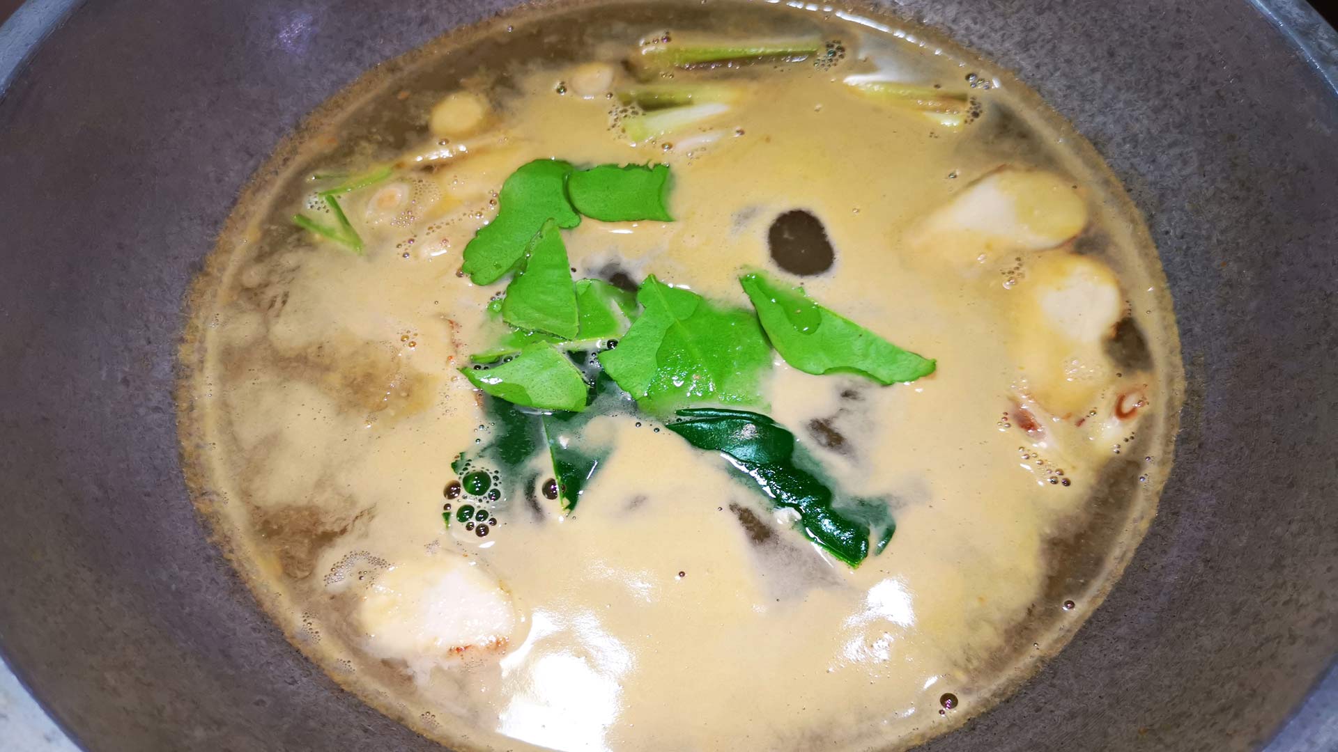 • Die Schalen herausnehmen und das Zitronengras, den Thai-Ingwer und die Kaffir-Limettenblätter in die Brühe geben und alles weiterhin einige Minuten köcheln lassen.
