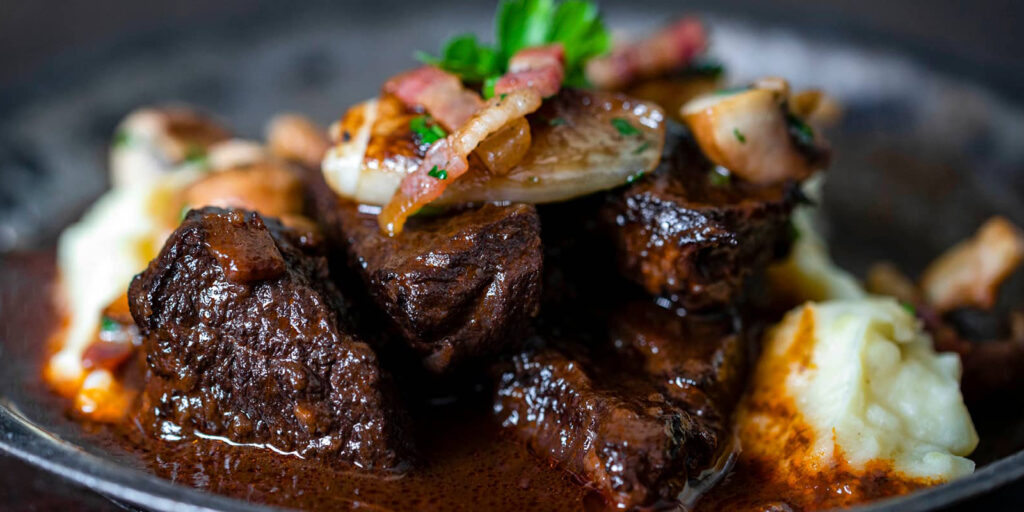 Die Herkunft des Schmorklassikers Boeuf Bourguignon erklärt sich bereits durch die Übersetzung und kulturelle Verbindung der beiden Worte Boeuf und Bourguignon. Beginnen wir mit dem zweiten Wort: „Bourguignon“ bedeutet so viel wie „aus dem Burgund“ – also aus der Region im Dijon. Dort wachsen einige der rennomiertesten Weine Frankreichs, wenn nicht sogar der Welt – speziell die Chardonnays und Pinot Noir (auf deutsch: Spätburgunder) haben in der Regel eine herausragende Qualität. Dass sich in dieser Gegend der Wein auch in der lokalen Kulinarik niederschlägt, ist kein Wunder. Dazu kommt die Tatsache, dass der Burgund auch Heimat der berühmten Rinderrasse Charolais ist – eine Fleischrasse mit magerem und sehr zartfaserigem Fleisch. Das charakteristische Boeuf (franz. für Rind) verbindet sich in diesem Gericht als den Burgunder Wein zu einem Klassiker mit Weltruhm, der seine Fazination bis heute erhalten hat.