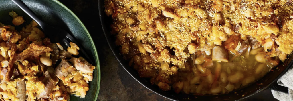 • Das Paniermehl auf dem Cassoulet verteilen und mindestens 3 Stunden backen. Es bildet sich eine Kruste, die sieben Mal untergerührt werden soll.