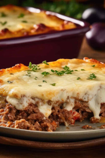 Griechische Moussaka vereint Kartoffeln, Hackfleisch, Auberginen und Tomaten unter einer feinen Käsehaube. Mit cremiger Béchamelsauce wird der Auberginenauflauf so unglaublich lecker!