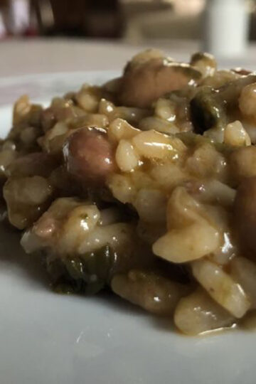 Die Paniscia ist eigentlich kein Risotto, sondern eher ein Reis-Bohnen Eintopf. Sie ist nicht so sämig wie ein gutes Risotto, sondern ein kleines bisschen trockener.
