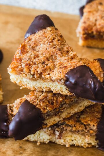 Nussecken sind eine herrliche Kombination: knuspriger Mürbteigboden, fruchtige Marmelade, karamellisierte Nüsse und ein wenig zartbittere Schokolade.