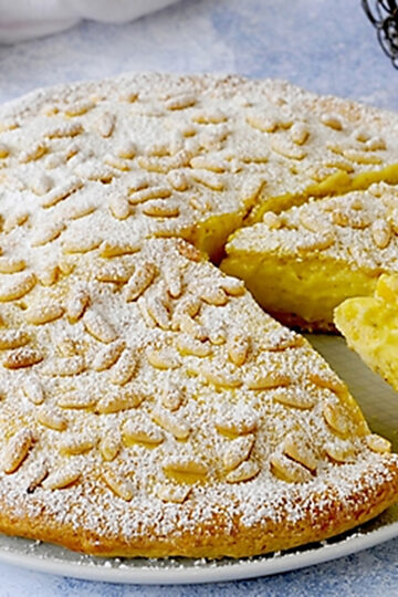 Eine der wenigen Kuchen, die Eingang in große Küche finden: Die Torta della nonna aus Mürbeteig, Zitronen-Vanillecreme und Pinienkernen.