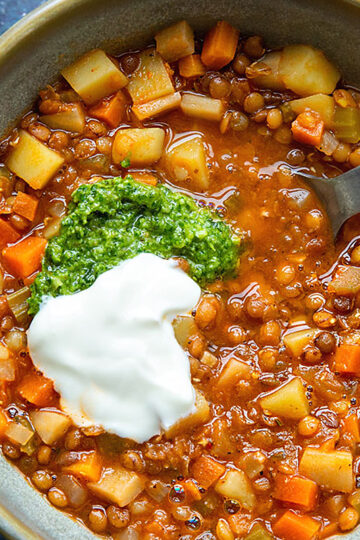 Genau das richtige für einen eiskalten Wintertag: Ein wärmender Linseneintopf mit Gewürzen der Provence! Am besten mit einem Klecks saurer Sahne und/oder einem Löffel Pesto servieren.