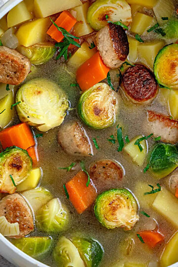 Gerösteter Rosenkohleintopf ist schon vegetarisch ein großer Genuss! Selbst Brühe braucht es nicht zwingend als Basis, da das Gemüse und die Kräuter sehr viel Geschmack geben. Dennoch mag ich die Kombination von Kohl und Hackfleischbällchen.