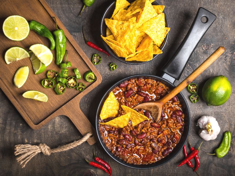 Der Name sagt Fleisch. Also kein Hackfleisch! Und um Gottes Willen keinen Mais. Avocados kann man als Guacamole dazu reichen …. aber bitte nicht im Chili mit auflösen.