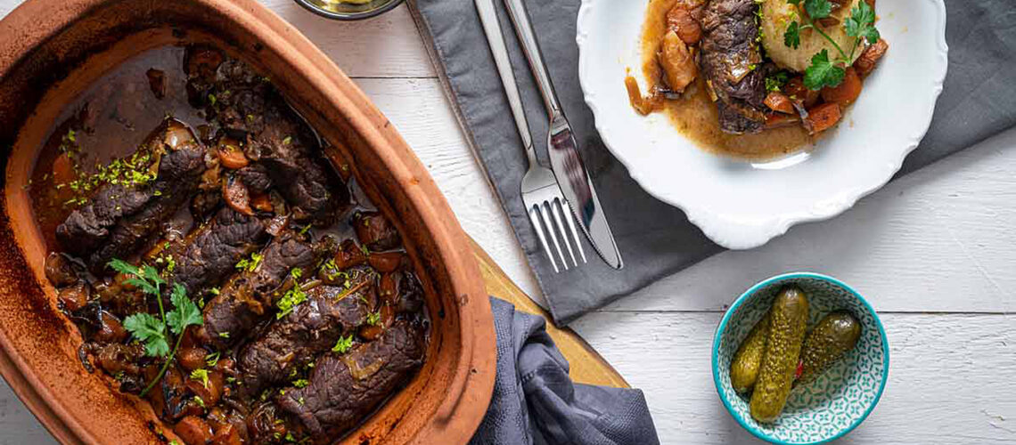 Das Geheimnis perfekter Rouladen: bestes Fleisch, Geduld beim Anbraten und viel Flüssigkeit zum Schmoren. Und das Fleisch mit Liebe plattieren. Wie das geht? Man braucht keine extra Werkzeug. Ein großer Frischhaltebeutel und ein Stiltopf mit dickem Boden und schon kann’s losgehen.