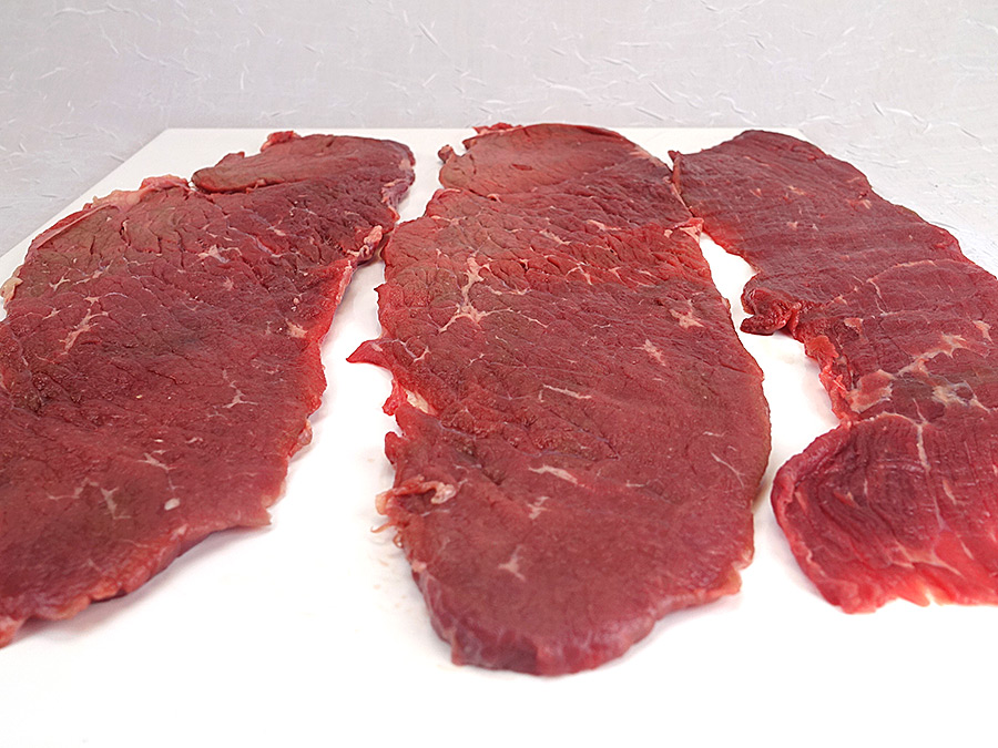 - Ein langes Stück Klarsichtfolie oder Frischhaltetüte mit Öl einpinseln. Die Rouladen dazwischen mit dem Plattiereisen oder dem Boden einer kleinen Pfanne dünn ausklopfen.