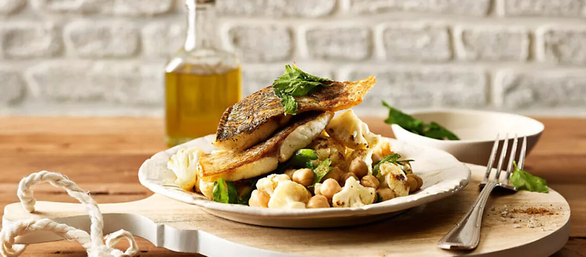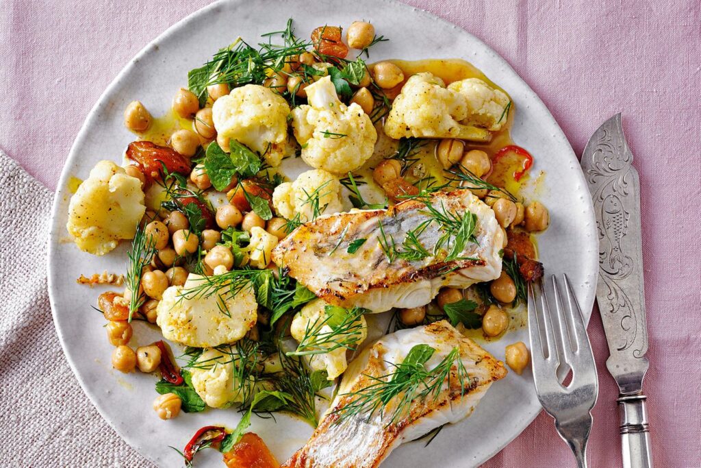 Fisch auf Blumenkohl-Kichererbsen-Salat