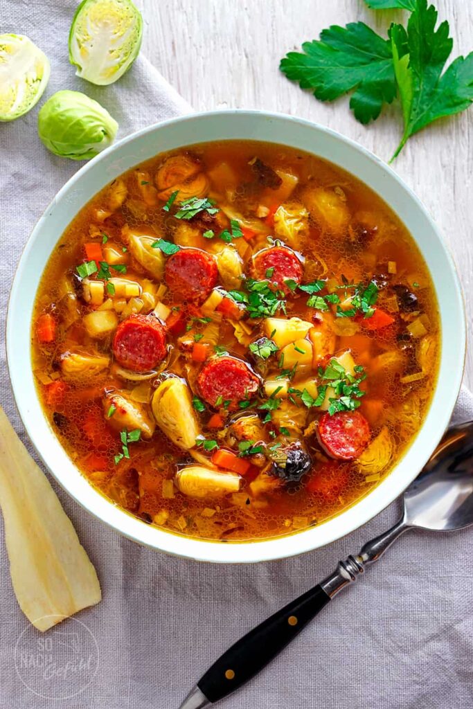 Gerösteter Rosenkohleintopf ist schon vegetarisch ein großer Genuss! Selbst Brühe braucht es nicht zwingend als Basis, da das Gemüse und die Kräuter sehr viel Geschmack geben. Dennoch mag ich die Kombination von Kohl und Hackfleischbällchen.