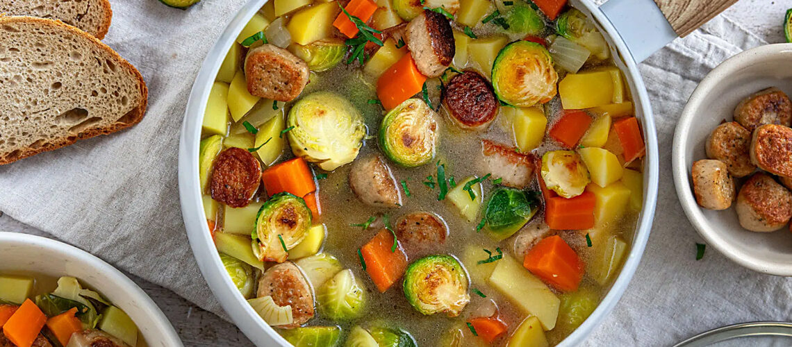 Das vollmundige Aroma macht ihn unwiderstehlich: Gerösteter Rosenkohleintopf ist der perfekte Begleiter an kalten, ungemütlichen Tagen. Dafür lohnt es sich, erst einmal den Backofen anzuwerfen, bevor der Eintopf auf den Herd kommt.