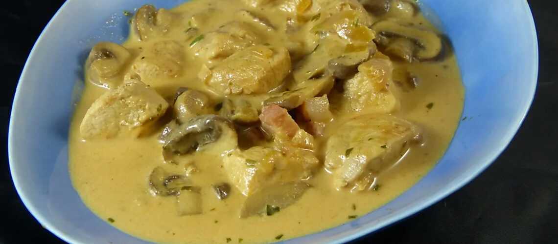 • Zwiebel in Butter goldgelb anbraten. Das Hähnchenfleisch dazugeben und mit etwas Hühnerbrühe auffüllen. Alles kurz aufkochen lassen.