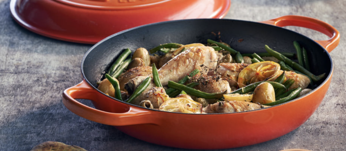 • Olivenöl im Bräter erhitzen und die Hähnchenteile darin anbraten. Kartoffelhälften und Zitronen dazulegen, mit der Marinade und der Hälfte des Thymians bestreuen und mit der Brühe angießen. Anschließend alles im vorgeheizten Backofen zugedeckt 40 Minuten schmoren lassen, dabei das Fleisch ab und zu wenden.