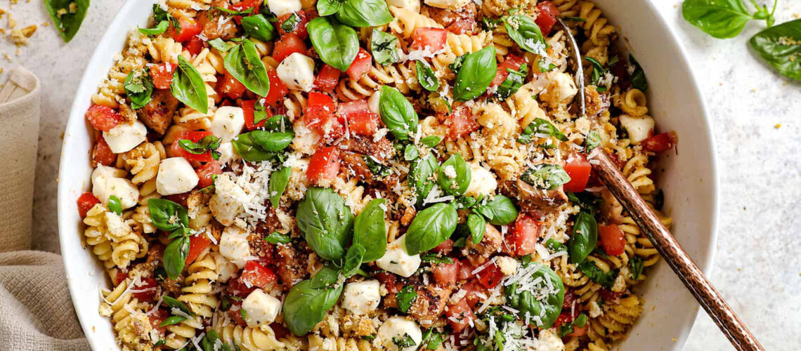 Dieser Nudelsalat mit Hähnchenfleisch ist in seiner Variante mal etwas andere. Dieser Hähnchen-Nudelsalat macht satt, ohne schwer im Magen zu liegen. Er ist eine toller Mischung aus würzigem Balsamico, frischem Basilikum und aromatischem Knoblauch mit leuchtenden Tomaten, saftigem Balsamico-Hähnchen, nussigem Parmesan, buttrigem Mozzarella und knusprigen Croutons.