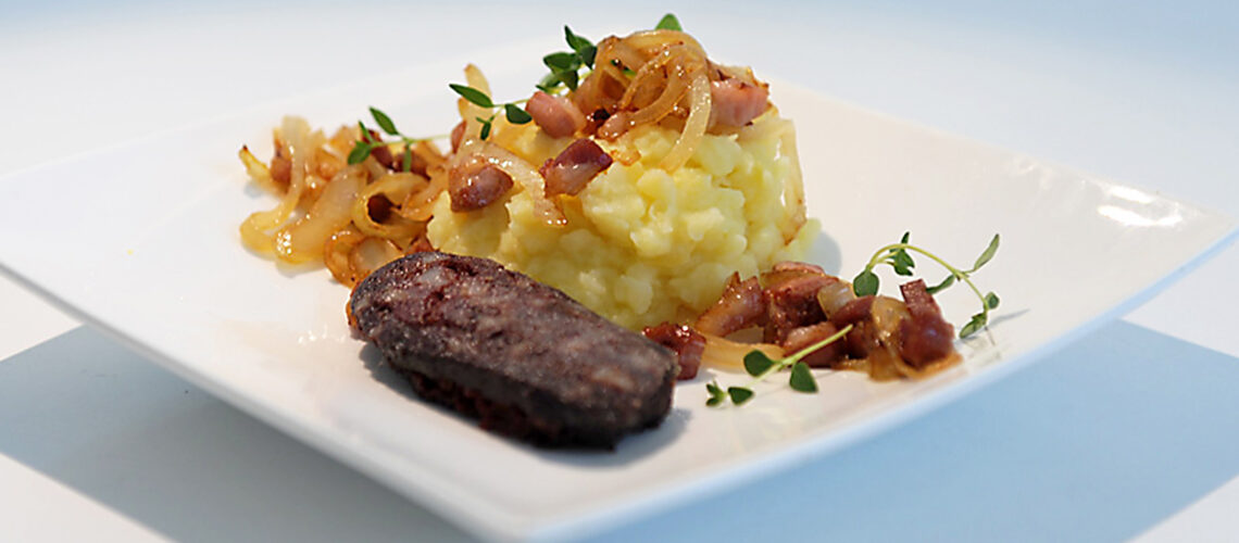 • Kartoffelpüree und Apfelmus auf Teller portionieren. Gebratene Blutwurst darauf anrichten, mit Röstzwiebeln bestreuen und gleich servieren