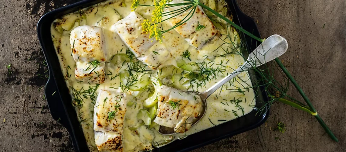- Den Kabeljau in 4 Portionen teilen. Mit Salz und Pfeffer würzen und auf die Gurken legen. Die Crème-fraîche- Mischung über die Fischfilets verteilen.