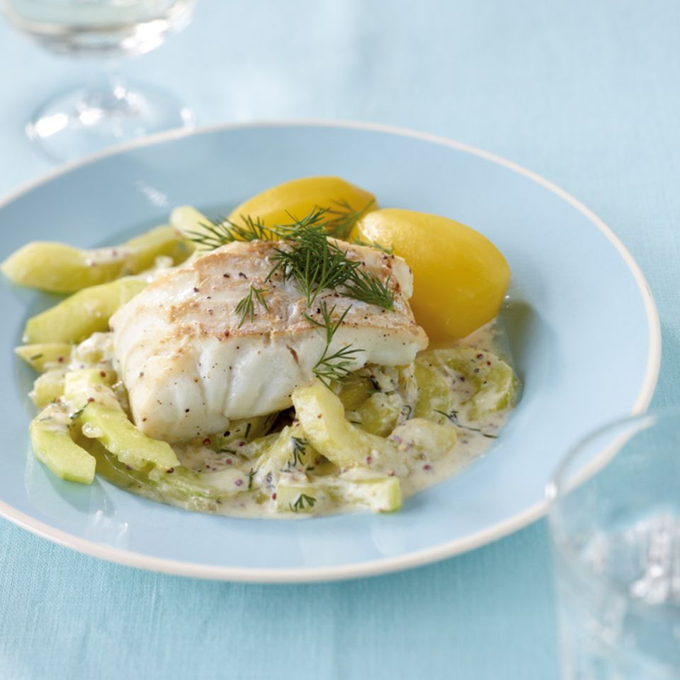 Hallo Sommer! Heißes, frisches Gurken-Gemüse mit Dill trifft auf Kabeljau in Senfsauce. Dieses raffinierte Essen mit einem leicht fruchtigen, leicht würzigen Wein – einfach herrlich. Wer mag, reibt vor dem Servieren frischen Meerrettich über das Gericht, das sorgt für zusätzlichen Geschmack.
