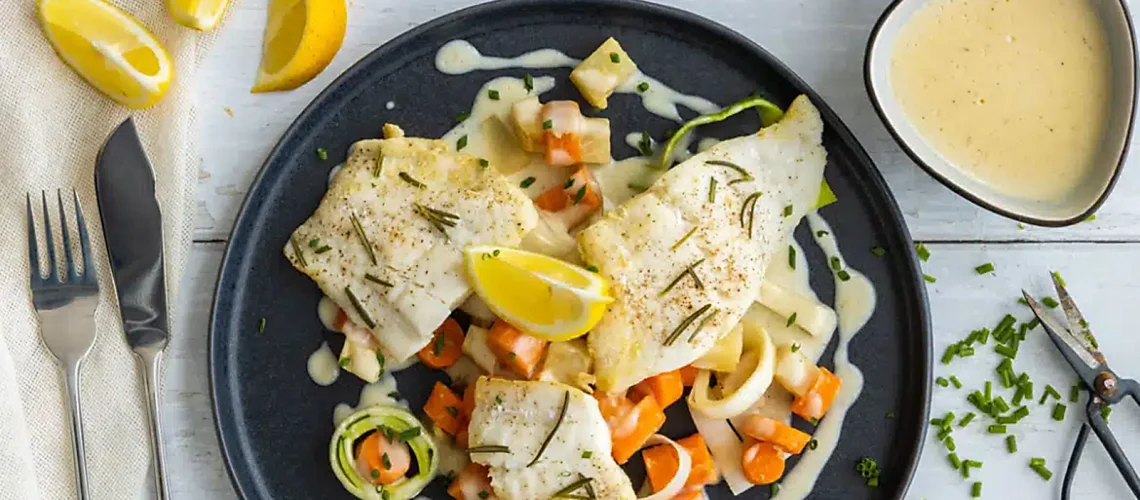 Kochfisch mit Senfsoße und Wurzelgemüse