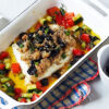 • Fisch und Gemüse mit einer Schaumkelle auf einen Teller geben und im Backofen warmstellen