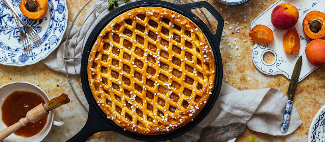 Aber da ich immer ein Verfechter von frischen Zutaten bin, kommen in meine Version natürlich nur frische Aprikosen rein – und zwar jede Menge! Das Aprikosenriemchen besteht aus einem weichen Hefeteig, aus dem Boden und Gitter geformt werden, randvoll gefüllt mit – na klar, Aprikosen. Für das typische Riemchengitter gibt es spezielle Gitterstanzen, mit denen Du ruckzuck das perfekte Gitter hinbekommt. Falls Du keines hast, kannst Du aber natürlich auch einfach Streifen aus dem Teig ausschneiden, ein bischen rollen und selber ein Gitter auf den Kuchen legen.