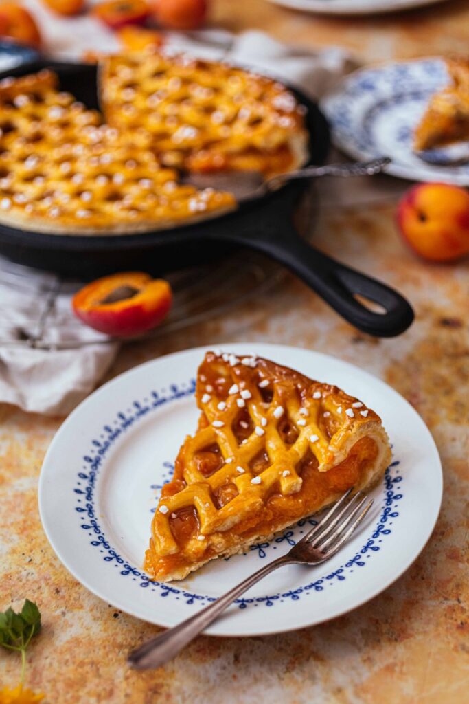 Für einen schönen Glanz wird das Aprikosenriemchen nach dem Backen mit warmer Aprikosenmarmelade bestrichen und mit Hagelzucker bestreut. Insgesamt ist es ein weniger süßer Kuchen, der dafür aber umso fruchtiger schmeckt. Dazu passt halbsteif geschlagene Sahne. Ich verwende in meinem Rezept ungekochte Aprikosen, weil dadurch der Fruchtgeschmack besser erhalten bleibt und der Kuchen frischer schmeckt. Allerdings bleibt die Füllung so auch etwas weicher und läuft beim Anschnitt des Riemchens leicht heraus. Wenn Du das vermeiden möchtet, kannst Du die Aprikosen vor dem Backen einkochen, damit die Masse fester wird, und ggf. etwas mehr Speisestärke hinzugeben. Pass aber auf, dass der Stärkegeschmack nicht zu dominant wird.