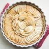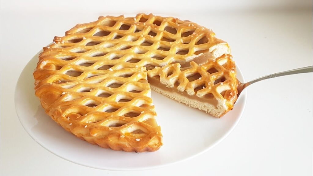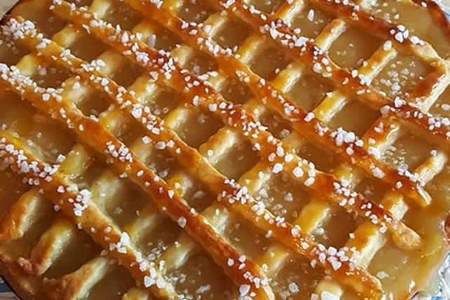- Eine Pizzaform oder ofenfeste Pfanne (24cm Ø) einfetten und den Teig hineinlegen, sodass die Form vollständig ausgefüllt ist. Die Aprikosenmasse hineingeben und glatt streichen. Das vorbereitete Teiggitter darauflegen, an den Rändern leicht festdrücken und ggf. zurechtschneiden.