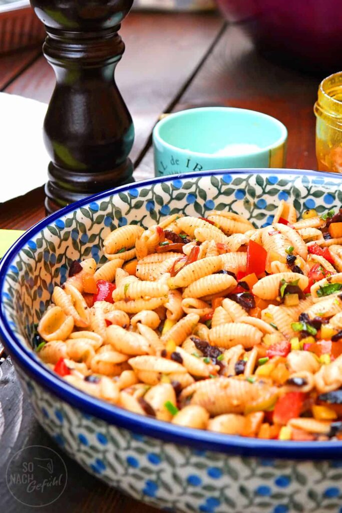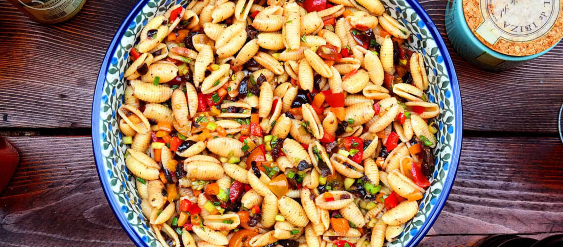 Nudelsalat! Da kommen Erinnerungen an die Kindergeburtstage früherer Tage hoch. Nudelsalat nach F mit Dosenerbsen, Fleischwurstwürfeln und Mayonnaise. Das war einmal der Inbegriff von „Lecker“. Heute hingegen machen wir einen Nudelsalat aromatisch, mediterran und frisch. Denn die Kombination von Tomaten, Paprika, Basilikum und schwarzen Oliven machen ihn unwiderstehlich lecker. Wobei – manchmal muss es auch noch der Nudelsalat von früher sein, mit Mayo und allem drum und dran.