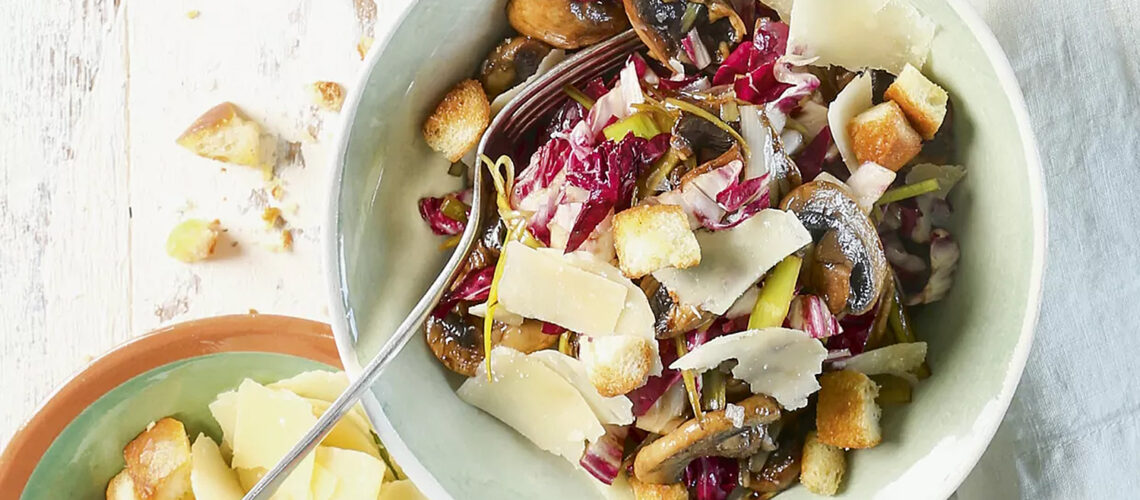 - Vor dem Essen den Radicchio und gut die Hälfte der Parmesanspäne zum Pilz-Lauch-Salat geben, alles sorgfältig mischen und wenn nötig mit Balsamico, Olivenöl, Salz und Pfeffer abschmecken. Den Salat in tiefen Tellern anrichten und mit dem restlichen Parmesan sowie den Brotwürfeln bestreuen.