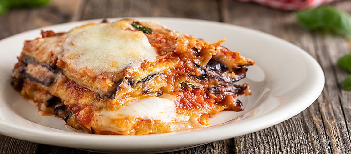 Parmigiana di Melanzane ist ein Auberginen-Auflauf aus der süditalienischen Küche. Mit reichlich Tomate und Mozzarella, gratiniert mit Parmesankäse.