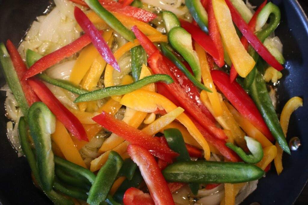 Für eine gute Peperonata ist es wichtig, alle 3 Farben zu verwenden, denn jede Paprika besitzt in ihrer Farbe unterschiedliche Aromen. Neben neben den Zwiebeln, welche der Peperonata zusätzliche Würze verleiht, geben ich noch frische, in kleine Stücke gehackte Tomaten hinzu. Auch Basilikum darf nicht fehlen, denn es gibt zusätzlich Duft und Aroma.
