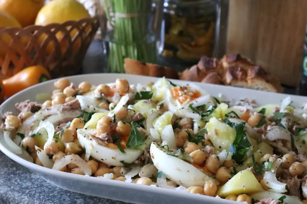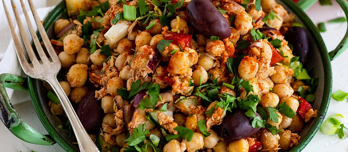 Ein erfrischender Salat mit Kichererbsen, Thunfisch und Koriander. Ideal für Sommer, Strand und Party.