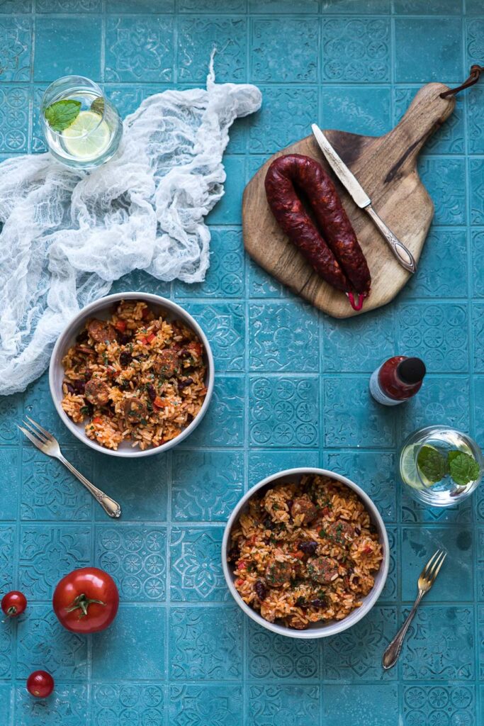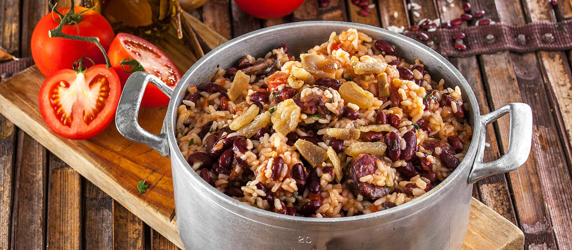 Es gibt Gerichte, die sind so herrlich simpel und unkompliziert. Einfach authentisch. Der Portugiesische Reis mit Bohnen, oder auch Arroz de Feijão, ist eines dieser Gerichte! Arroz de Feijão ist ein Reiseintopf, der mit Bohnen, Paprika, Tomate, Chouriço und Bacon verfeinert wird. Durch die Chouriço-Scheiben erhält er seinen charakteristischen Geschmack. Er wird gerne als Beilage zu Fleisch oder auch als Hauptspeise serviert. Natürlich darf auch eine ordentlicher Schuss Piri-Piri nicht fehlen!