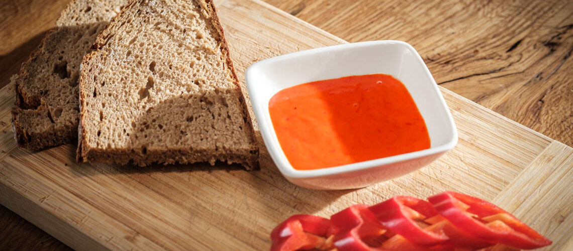 - Paprika putzen, vierteln und entkernen. Mit der Hautseite nach oben auf ein Backblech legen und unter dem vorgeheizten Backofengrill 8-10 Minuten grillen, bis die Haut schwarze Blasen wirft. Paprika in einem Gefrierbeutel 5 Minuten ausdämpfen lassen, herausnehmen und häuten. Paprika sehr fein schneiden.