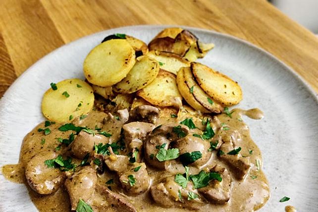 • Nieren und Zwiebel unter ständigem wenden goldbraun braten. Mit dem Weißwein ablöschen und die Fleischbrühe ablöschen. Salz, Pfeffer und Zitronensaft zugeben und bei kleiner Hitze ca. 10 Minuten schmoren.