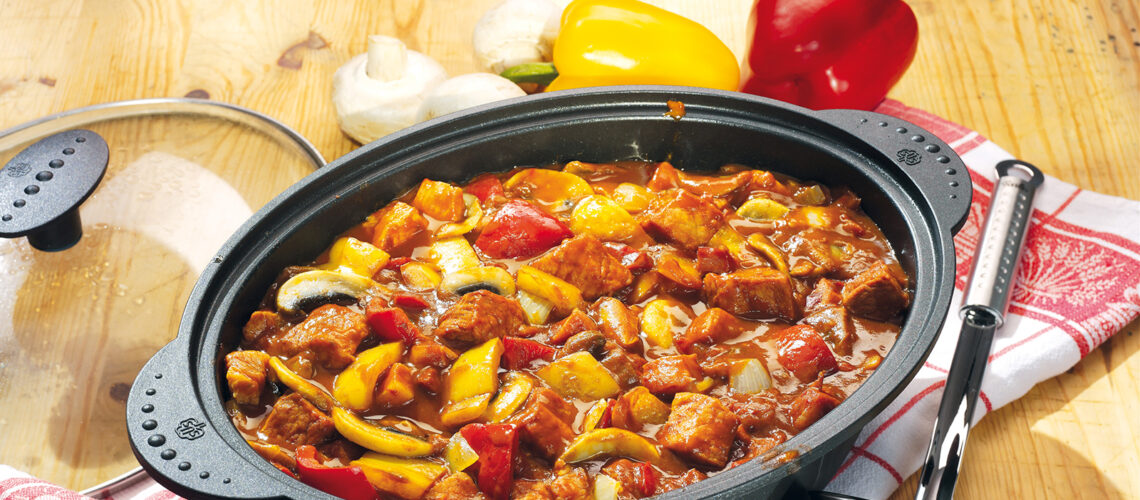 - In einer großen, hohen Pfanne etwas Öl erwärmen und das marinierte Fleisch und Gemüse etappenweise anbraten. Paprika und Zwiebel getrennt vom Fleisch.