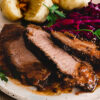 - Hitze reduzieren und das Schweinefilet in Scheiben schneiden und für 5 Minuten in der Sauce ziehen lassen.