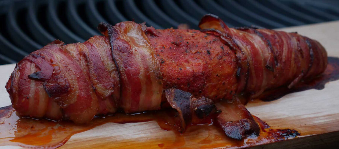 - Schweinefilet salzen und komplett mit dem Speck einwickeln. In Backofen oder in eine Pfanne backen bis die Speckhülle kross ist.