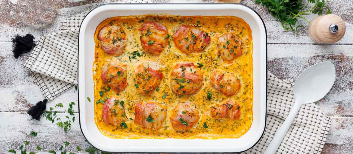 • Fleischpäckchen in eine gefettete Auflaufform setzen und 30 Minuten bei 200 Grad backen.