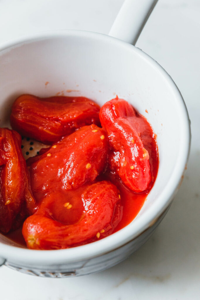 Aber halt! Nicht einfach in den Topf kippen. Die Tomaten werden abgegossen (frische Tomaten heiß überbrühen, kalt abschrecken und pellen) und auch das Kerngehäuse wird entfernt – alles auffangen und zuerst das Kerngehäuse und Tomatenwasser im aromatisierten Öl anschwitzen, bis es zu einer vor Umami nur so strotzenden Paste einreduziert ist.