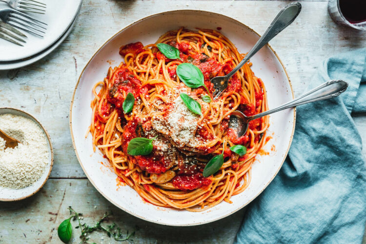 - Thymianzweige und Knoblauchzehen aus der Sauce nehmen, Parmesan und optional Butter unterrühren und mit Basilikumblätter getoppt servieren.