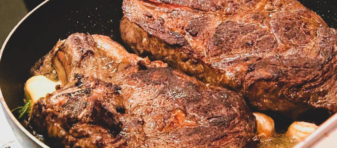 - Das Steak wird von beiden Seiten ca. 2 Minuten scharf angebraten. Wenn die Fleischporen vollständig geschlossen sind, lässt es sich ganz einfach wenden, wenn es festklebt am Pfannenboden, braucht es noch ein paar Sekunden. Ich brate das Steak dann noch einmal 1Minute von jeder Seite.