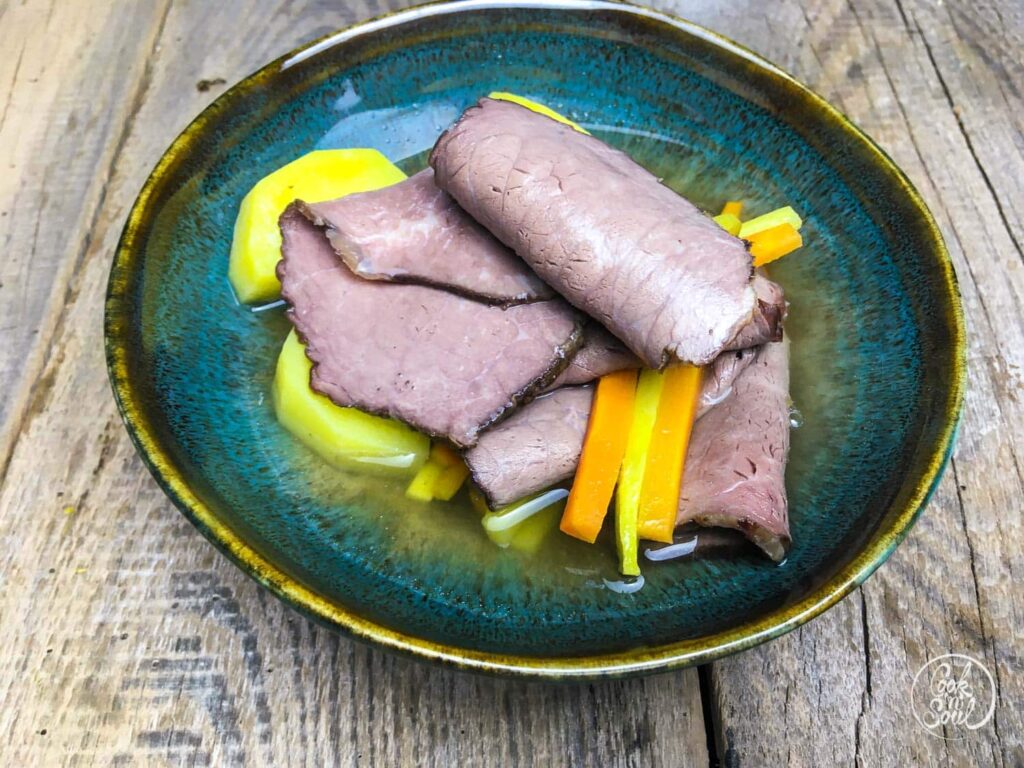 Tafelspitz kochen in Brühe ist ganz nach Wiener Tradition! Beim Wiener Original wird der Tafelspitz in heiße Brühe gelegt und darin unterhalb des Siedepunkts langsam gegart.