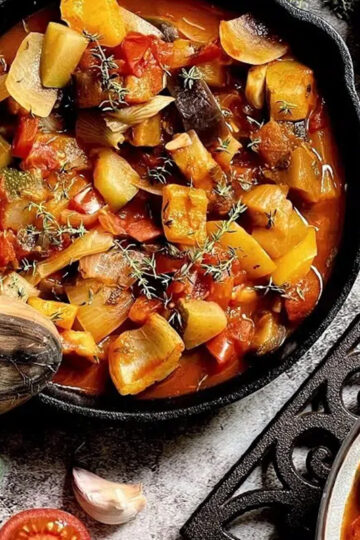Das vegetarische Gericht kann warm und kalt genossen werden. Früher war es ein Arme-Leute-Essen, da es aus Resten zubereitet wurde – heute steht das Schmorgericht für vegetarischen Hochgenuss.